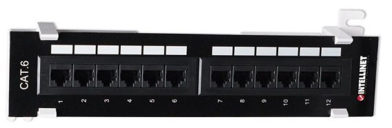 Patch panel naścienny, z 12 portami, okablowaniem typu U/UTP (nieekranowana skrętka 4 parowa).