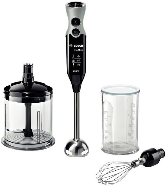 Blender ręczny o mocy 750 W, z 12 ustawieniami prędkości, funkcją pulsacyjną i turbo, stopą miksującą ze stali nierdzewnej, pojemnikiem do miksowania, końcówką do ubijania oraz rozdrabniaczem.