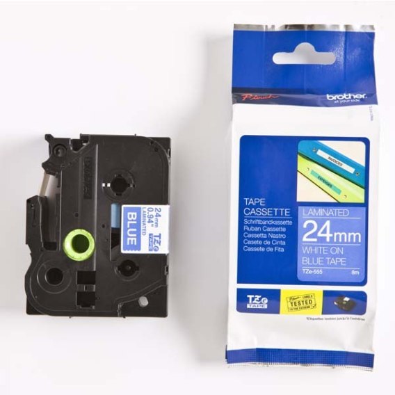 Brother oryginalny taśma do drukarek etykiet, Brother, TZE-555, biały druk/niebieski podkład, laminowane, 8m, 24mm