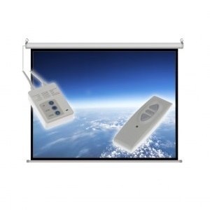 Elektryczny ekran projekcyjny o przekątnej 120 cali w kolorze białym matowym. Montaż do sufitu lub ściany. Sterowanie bezprzewodowym pilotem lub pilotem na przewodzie. Możliwość zatrzymania ekranu na dowolnej wysokości. Obudowa wykonana z metalu.