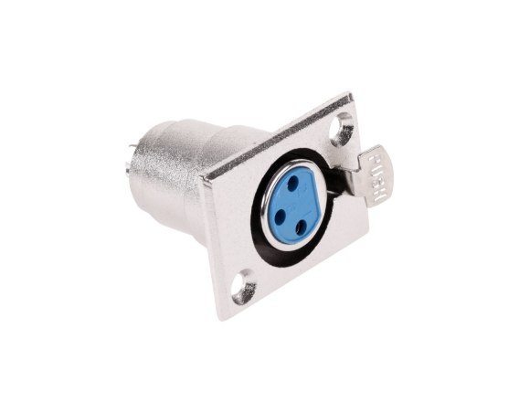 Gniazdo mikrofonowe typu XLR (canon) 3-pin źeńskie, chromowane, montażowe z zatrzaskiem uniemozliwiającym samoczynne wypadniecie wtyku