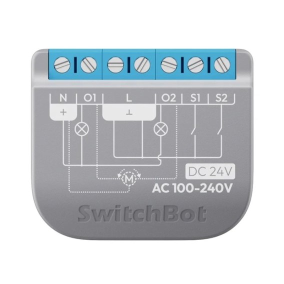 Moduł SwitchBot Relay Switch 2PM z schematem połączeń elektrycznych, złączami śrubowymi i oznaczeniami AC 100-240V