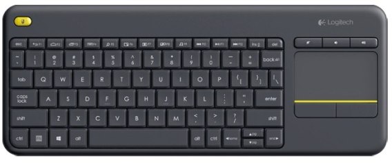 Bezprzewodowa klawiatura z panelem dotykowym. Ilość klawiszy: 82. 12 klawiszy funkcyjnych. Klawisze skrótów. Zasięg pracy: 10 metrów. Zasilana dwiema bateriami AA. Poziom hałasu podczas pisania: 55 dBA. Żywotność klawiszy: do 5 milionów naciśnięć. Wymiary: 139.9 mm x 354.3 mm x 23.5 mm. Waga: 380 gram. Plug and Play.