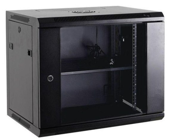 Szafa wisząca 19" o wysokości wewnętrznej 15 U. Maksymalna ładowność wynosi 100 kg.