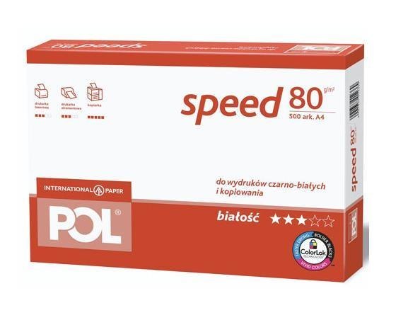 Informacje dodatkowe: Nieprzezroczystość >91%, Gramatura 80 g/m2, Doskonała funkcjonalność na wszelkich urządzeniach biurowych, Papier POL speed jest produkowany z zastosowaniem technologii ColorLok, Grubość 103 +/-3 mikrometry, Przeznaczony do użytku w kopiarkach i drukarkach laserowych, Zapewnia realistyczne wydruki podczas kopiowania czarno-białych dokumentów, Białość (CIE) 146+3