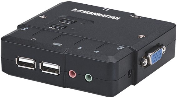 Dwuportowy przełącznik KVM ze złączami VGA, USB i 3.5 mm jack. Pozwala kontrolować 2 komputery za pomocą jednej klawiatury i myszy. Urządzenie pozwala na zarządzanie laptopami bądź komputerami stacjonarnymi posiadającymi porty VGA, USB, dodatkowo oferując możliwość obsługi głośników.