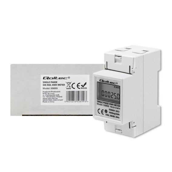 QOLTEC LICZNIK ZUŻYCIA ENERGII JEDNOFAZOWY NA SZYNĘ DIN | 230V | LCD | 2P