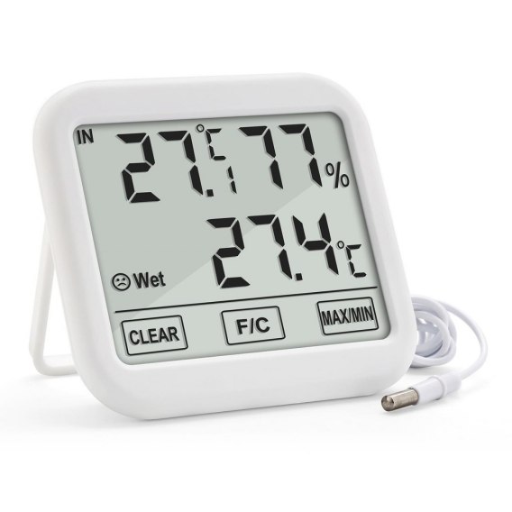 Informacje dodatkowe: Zakres wilgotności:10% ~ 99%, Zakres temperatury wewnętrznej: -10°C~50°C, Zakres temperatury zewnętrznej: -50°C~70°C, Dokładność: 0,1°C (temperatura) 1% RH (wilgotność), Częstotliwość odświeżania: 10 sekund, Materiał wykonania: tworzywo ABS, Zasilanie: 2x bateria: 1.5 V AAA (w zestawie), Wymiary produktu: 105 x 94 x 25 mm, Długość przewodu sondy: 150 cm, Wskaźnik poziomu komfortu
