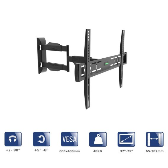 Informacje dodatkowe: Pochylenie +5° / -8°, Dystans od ściany: 47 mm, Wielkość ekranu 37", 40", 42", 43", 45", 52", 55", 60", 65", 70", 75", Obrót +/- 90°