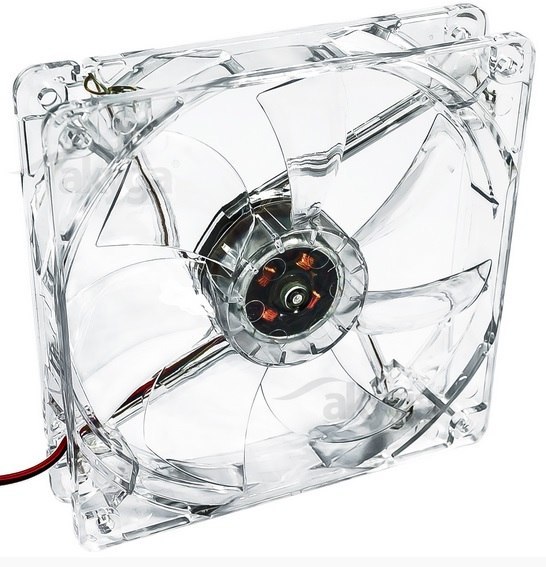 Wentylator o średnicy 120 mm z podświetleniem LED w kolorze niebieskim. Napięcie zasilające 12 V, natężenie 0.1 A. Złącze zasilania Molex 4-pin. Łożysko ślizgowe. 7 łopatek wentylatora. Prędkość obrotowa 1 000 obr/min. Przepływ powietrza 38.84 CFM. Natężenie hałasu 20 dBA. Rozstaw śrub montażowych 104.8 mm. Żywotność 30 000 h.