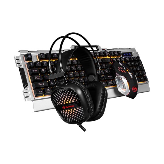 Marvo CM303, Zestaw klawiatur + mysz i słuchawki dla graczy, US, do gry, membranowa typ przewodowa (USB), czarno-srebrna, podświ