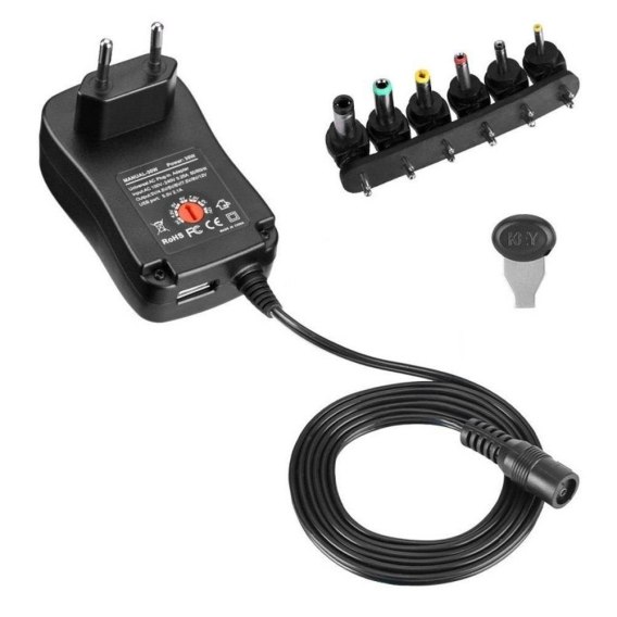 Informacje dodatkowe: Natężenie prądu wejściowego: 150mA, Wymienne wtyki DC (6 rodzajów):, 5.5 x 2.5 mm, 5.5 x 2.1 mm, 4.0 x 1.7 mm, 3.5 x 1.35 mm, 5.0 x 2.1 mm, 5.5. x 1.7 mm