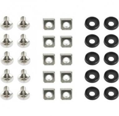 Zestaw montażowy dla urządzeń w szafie serwerowej 19" składający się śrub, nakrętek i podkładek. Zestaw składa się z 10 kompletów.